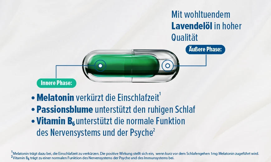 Hoggar® Melatonin DUO kombiniert zwei Effekte in einem: Die äußere Hülle der Melatonin-Retard-Kapseln enthält hochwertiges Lavendelöl. Dieses wird zeitnah im Körper freigesetzt und entfaltet rasch seine wohltuende Wirkung. Im Inneren der Melatonin-Kapseln befinden sich zusätzlich Pflanzenextrakte der Passionsblume. Diese sorgen für ruhigen Schlaf, während Vitamin B6 die normale Funktion des Nervensystems und der Psyche unterstützt.2 Dank der innovativen 2-Phasen-Technologie werden diese Inhaltsstoffe erst kurz vor dem Einschlafen frei.